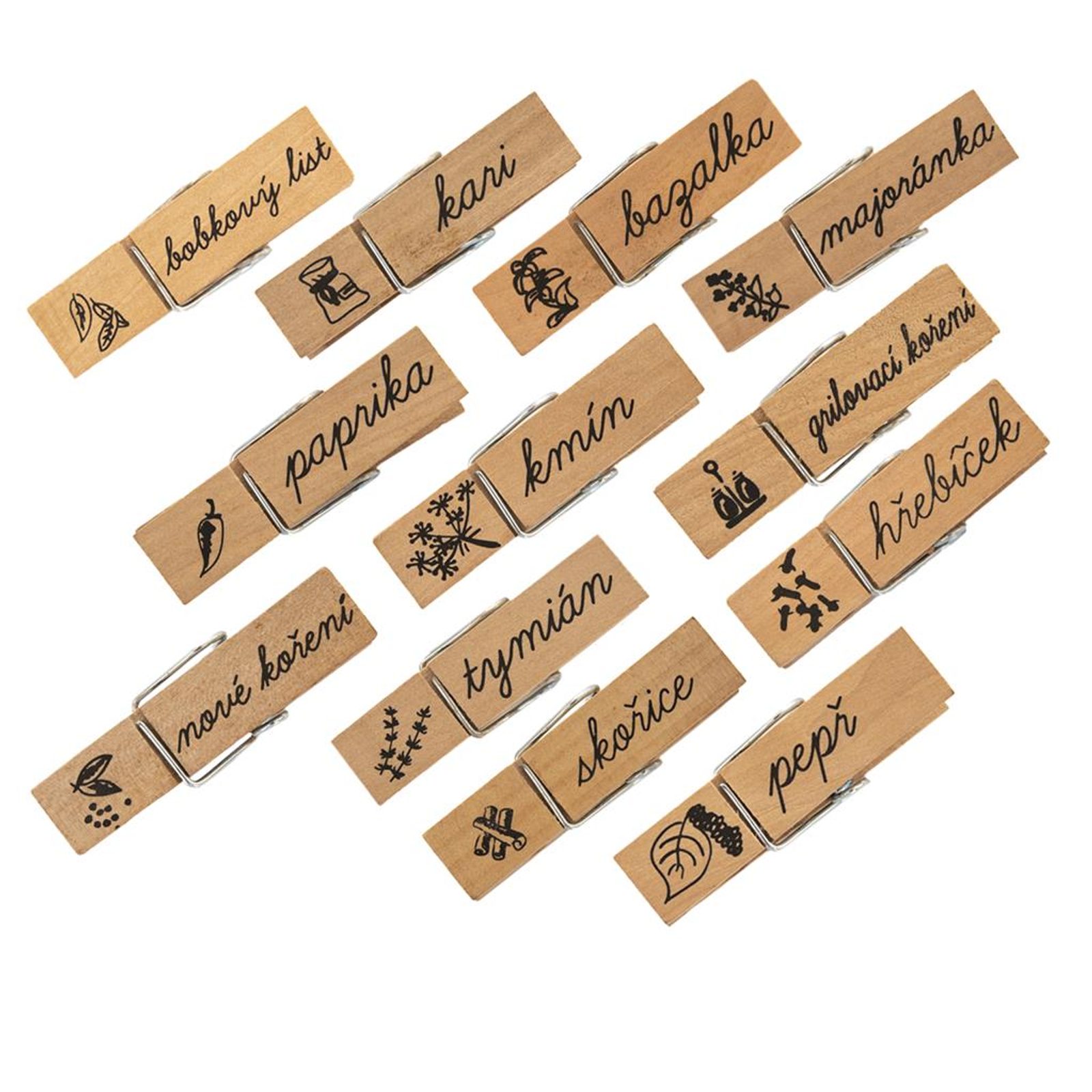 Drevené kolíky na korenie uzatvárajú vložené vrecko na korenie. Korenie nestráca arómu ani chuť, nerozlieva sa. Kolíky sú označené popisom a obrázkom - budete mať skvelý prehľad.