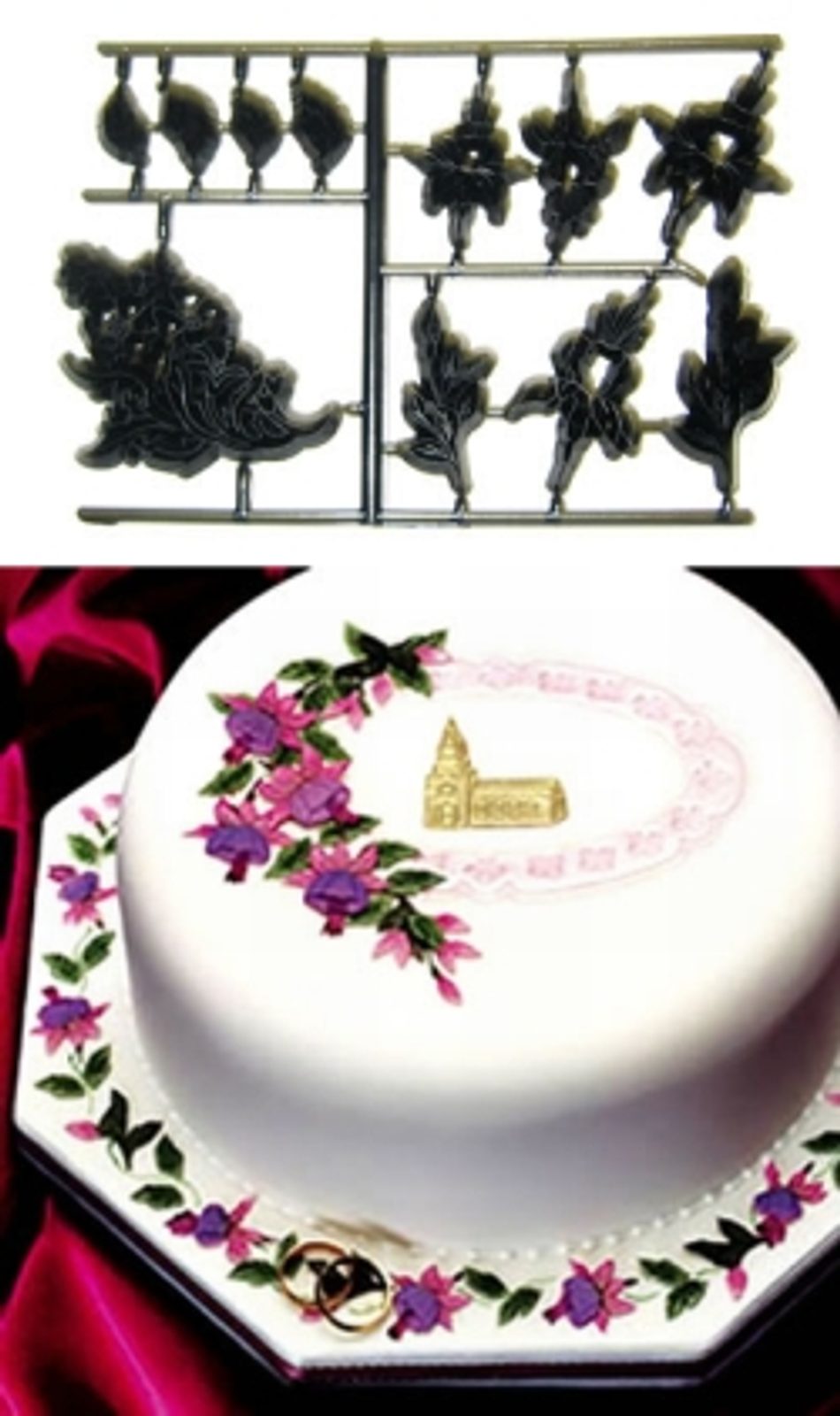 Plastový vypichovač v tvare fuchsie. Kvetinový motív dobre vynikne na hladko potiahnutých slávnostných tortách, na svadobných tortách a tortách pre dievčatá a dámy.