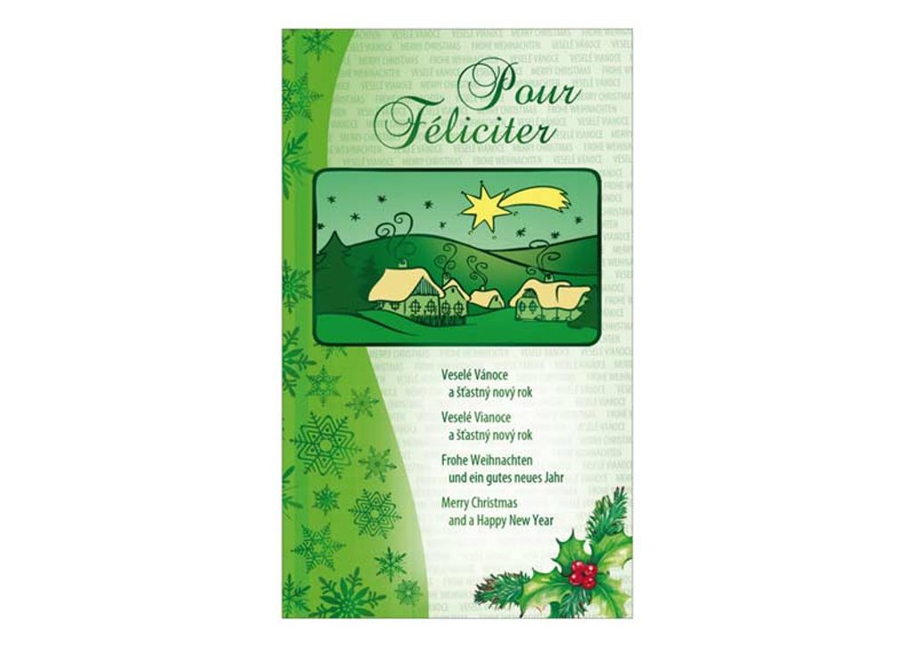 Novoroční přání neboli PF. Nezapomeňte popřát známým do nového roku. Zajisté je potěší, že jste si na ně vzpomněli. Text na přední straně přání: Pour Féliciter Veselé Vánoce a šťastný nový rok Veselé Vianoce a šťastný nový rok Frohe Weihnachten und ein gutes neues Jahr Merry Christmas and a Happy New Year Text uvnitř přání: Vážení obchodní přátelé, děkujeme Vám za dosavadní úspěšnou spolupráci. Přejeme Vám pěkné prožití vánočních svátků a v nadcházejícím roce mnoho štěstí, zdraví a osobních i pracovních úspěchů. Papír: pohlednicový karton 240 g Přání je baleno v sáčku, součástí balení je i dopisní obálka.