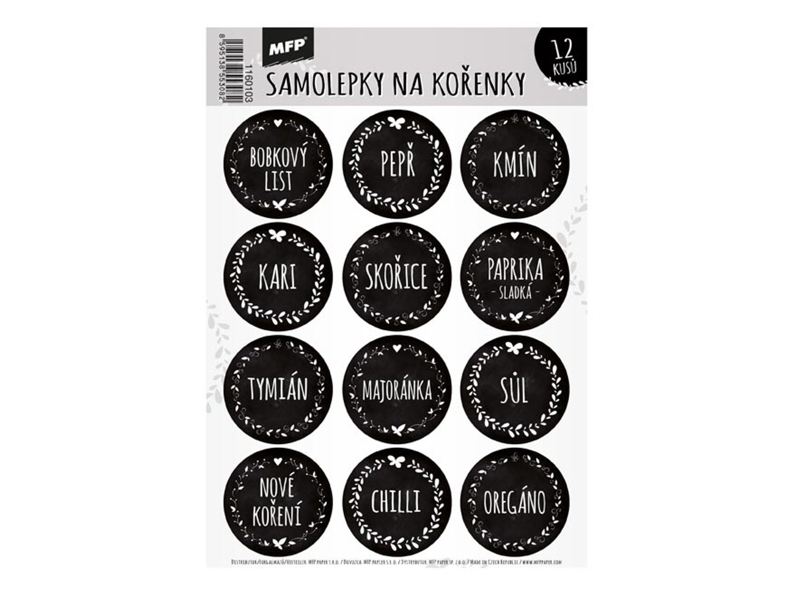 Samolepky na kořenky - s textem - Označte si dózičky s kořením těmito samolepkami, pro snadnější přehled ve Vaší kuchyni! Aršík obsahuje 12 samolepek. Uvedená cena je za 1 aršík.