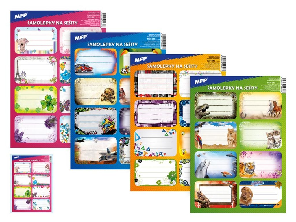 Samolepky na sešity - Krásný design samolepicích jmenovek na sešity zkrášlí každý obyčejný sešit! 1 ARŠÍK OBSAHUJE: - 8 různých motivů samolepek k polepení sešitů a každá samolepka obsahuje 4 řádky, do kterých se vypíše jméno a příjmení, předmět, školní rok, třída žáka, název školy Rozměr archu: A5 Uvedená cena je za 1 arch. Dodáváme v mixu ve 4 různých variantách dle skladové zásoby.