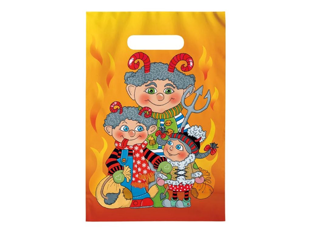 Igelitová taška s průhmatem v Mikulášském motivu. Na tašce je obrázek tří čertů. Praktické balení - odtrhávací blok. Rozměr: 20x30x8 Materiál: PE Uvedená cena je za 1 ks. Všech 50 ks je balených v sáčku.