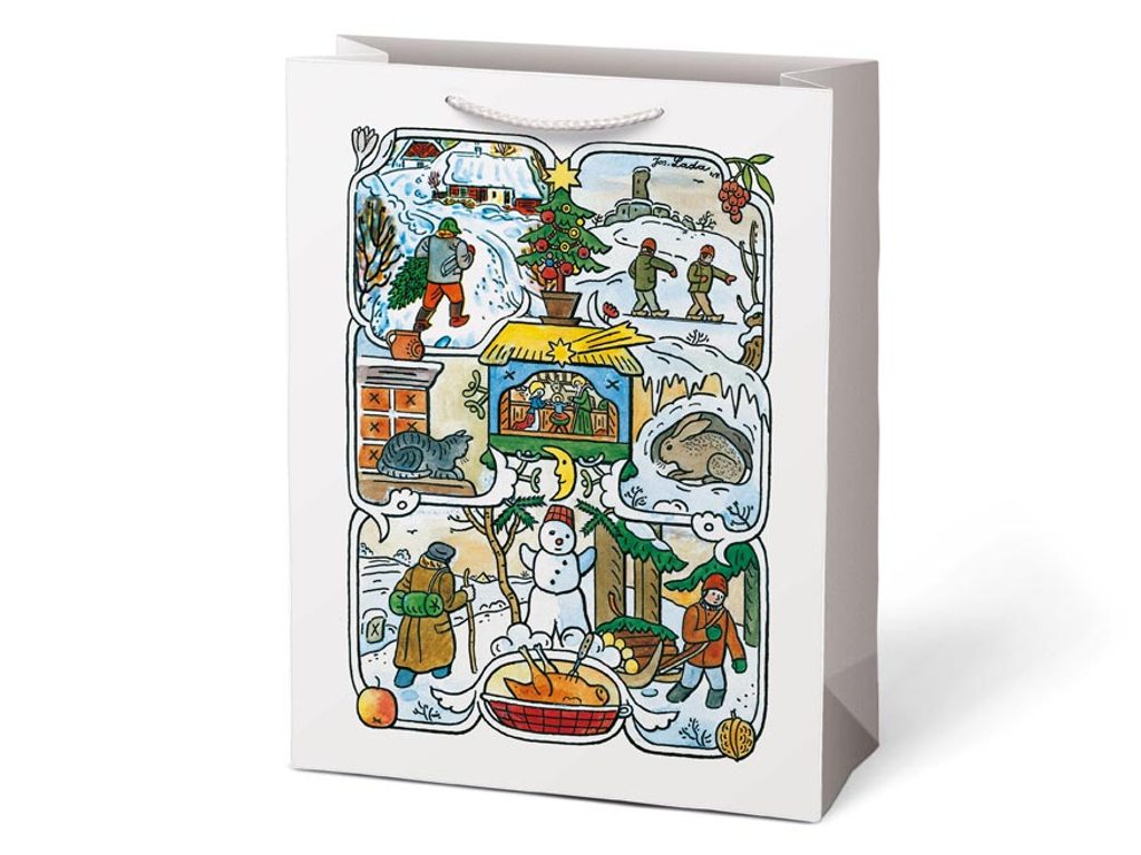 Papírová vánoční dárková taška s vánočními motivy od Josefa Lady (bílá, červená, světle modrá, tmavě modrá) - Každý dárek musí být v něčem zabalený. Pokud nemáte čas balit ho do balicího papíru, máme pro Vás na výběr nejrůznější dárkové tašky. Taška má pevné ucho pro snadné přenášení a štítek pro vepsání jména či přání. Povrchová úprava: Lak Uvedená cena je za 1 ks. Dodáváme v mixu po 4 ks dle skladové zásoby.