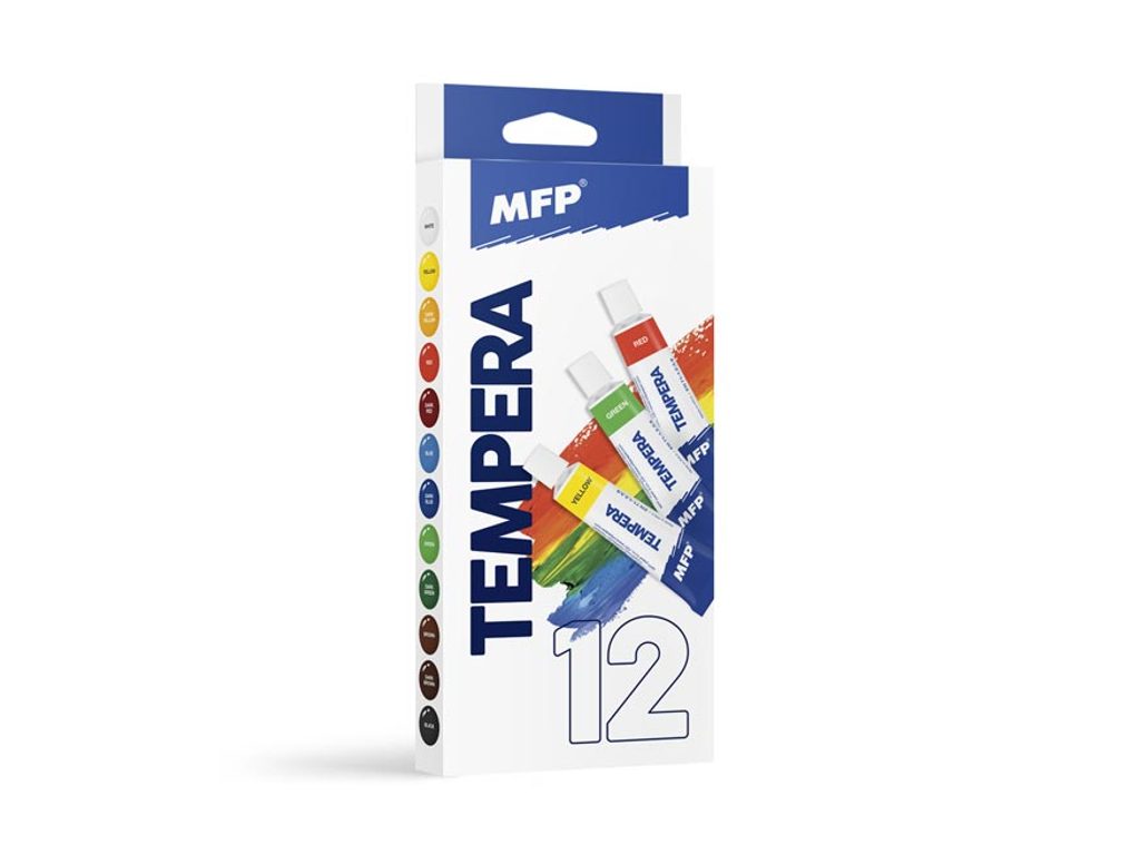 Sada temperových barev MFP - Namalujte si s dětmi obrázek pomocí temperových barev, které vynikají jasnou barevností. Děti můžou malovat štětcem, ale i prsty. - vysoké krycí vlastnosti - žádné toxické látky - pro školní a hobby použití - tempery jsou v hliníkové tubě BALENÍ OBSAHUJE: - 12 ks barev - světle modrá, tmavě modrá, světle zelená, tmavě zelená, světle žlutá, tmavě žlutá, světle červená, tmavě červená, světle hnědá, tmavě hnědá, bílá, černá Obsah barvy v jedné tubě: 12 ml VAROVÁNÍ: Nevhodné pro děti do 3 let. Nebezpečí spolknutí malých částí. EN71 - 1,2,3,9 Uvedená cena je za 1 balení. Dodáváme v papírové krabičce.
