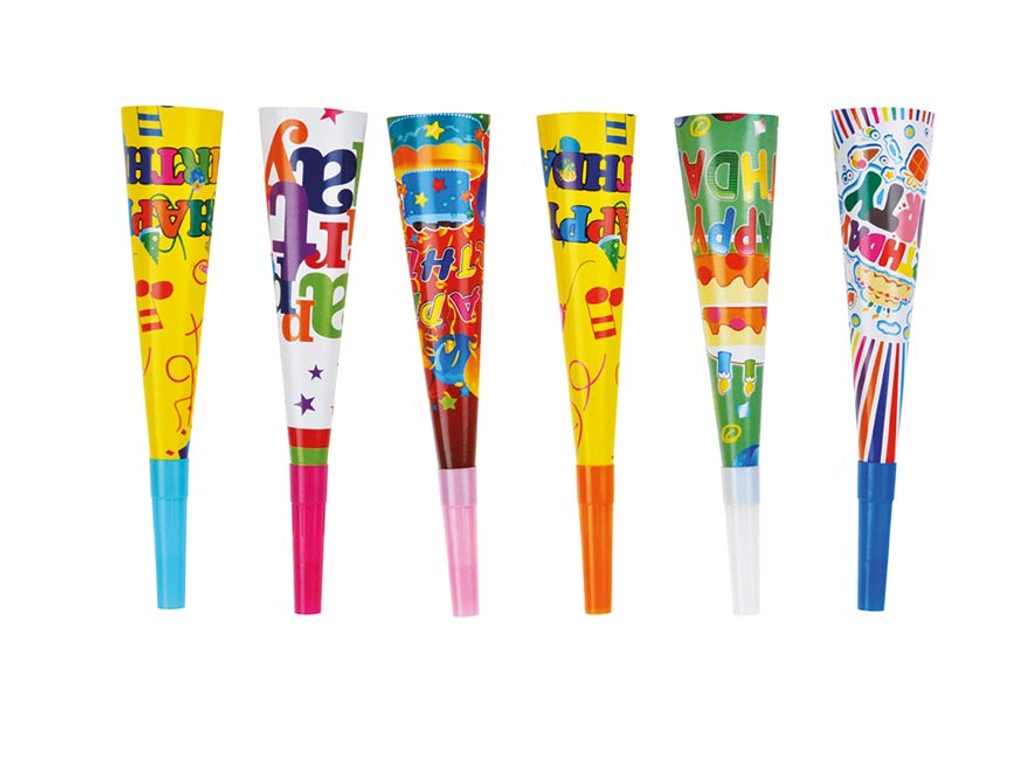 Papírová párty trumpetka s plastovým náustkem BALENÍ OBSAHUJE: - 6 ks barevných papírových trumpetek s nápisy "Happy Birthday" VAROVÁNÍ: Nevhodné pro děti do 3 let. Nebezpečí vdechnutí a spolknutí malých částic. Produkt je zdravotně nezávadný Uvedená cena je za 1 balení. Dodáváme v sáčku se závěsem.