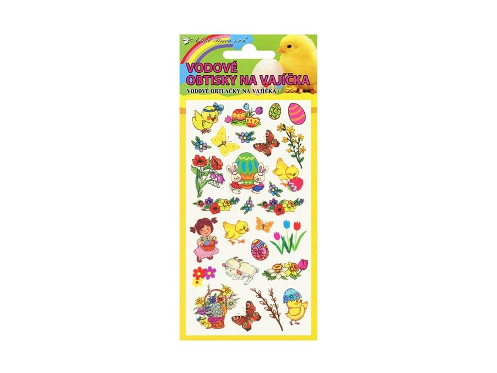Vodové obtisky na vajíčka s velikonočními motivy. Na podkladovém papíře je 28 barevných obtisků s různými jarními motivy. Jak nalepit obtisk na velikonoční vajíčko: 1. Vystřihněte zvolený motiv 2. Odstraňte krycí fólii a celý obrázek ponořte do misky s vodou. 3. Přiložte na vařené vajíčko obrázkem na skořápku, jemně přitiskněte, počkejte 20-30 sekund a opatrně odstraňte podkladový papír. 4. Nechte zaschnout.